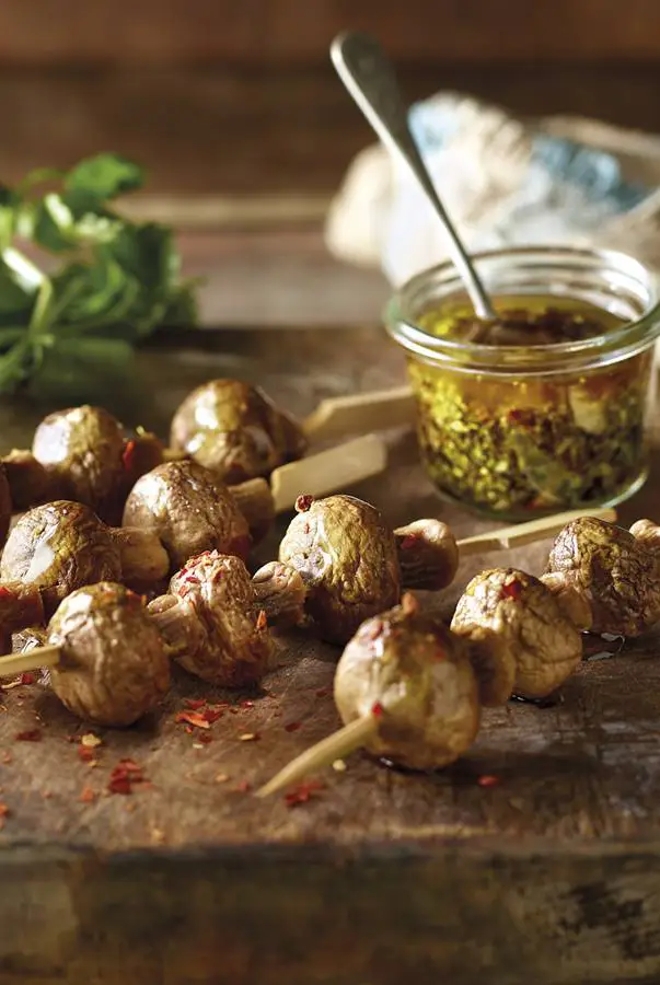 Inserta un palillo en el tallo y ensarta los champiñones uno tras otro. Sobre brasas de calor medio, cocina 15 min, girando con frecuencia y pincelando con más aceite si se secan.